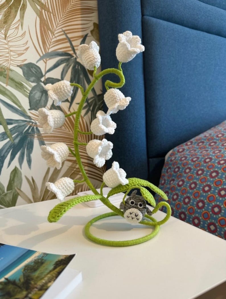 This charming lily of the valley lamp features delicate crocheted flowers with built-in lights, and a playful Totoro figure beneath the base.